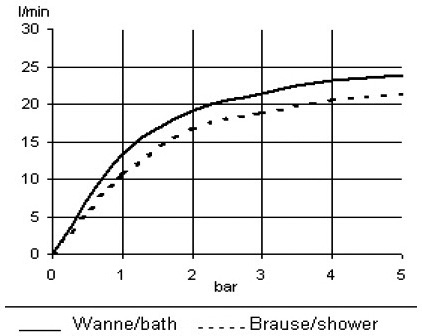 flow-rate bath 23 ltr/min, shower 19 ltr/min at 3 bar